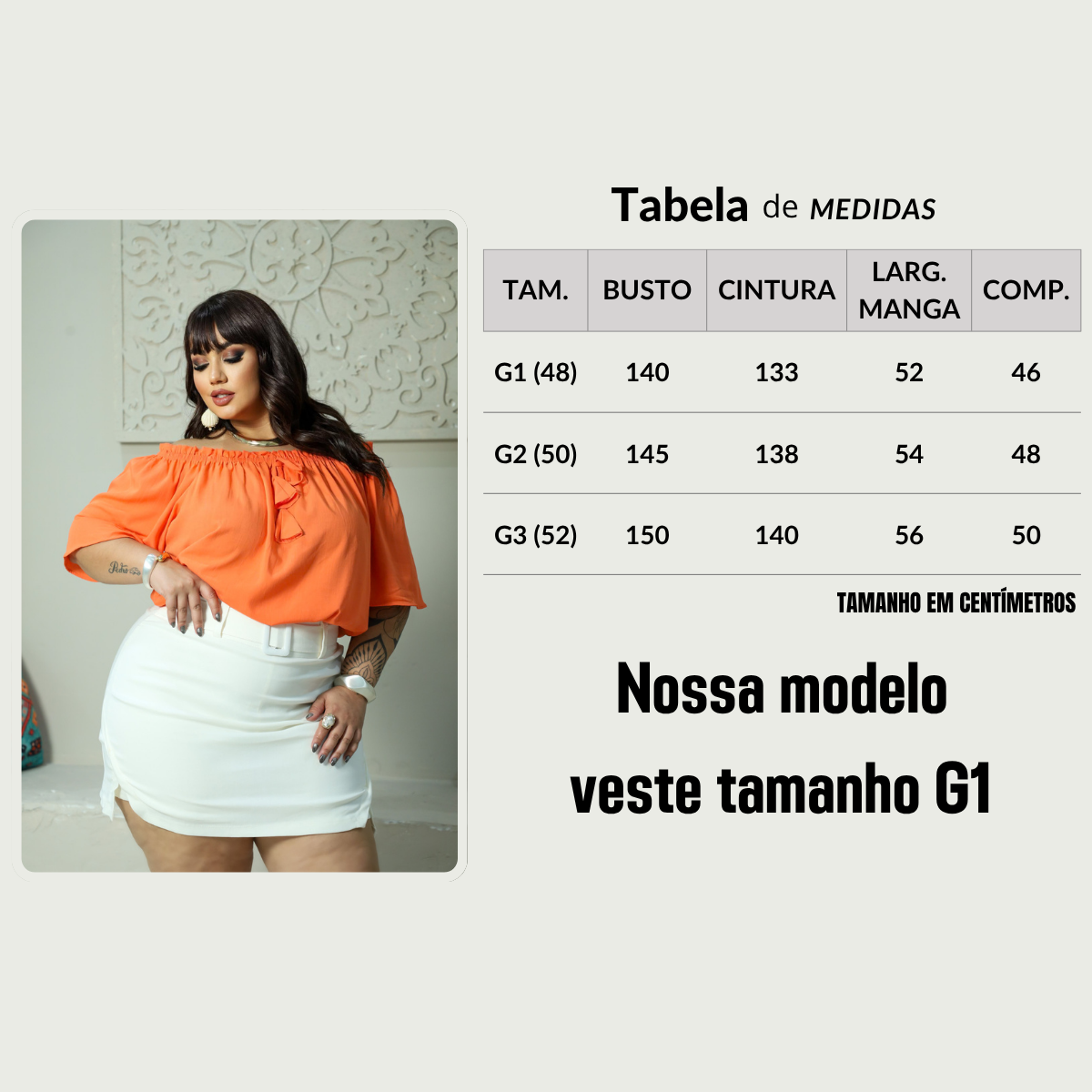 Nossa modelo usa manequim 48/50 e está vestindo G1.